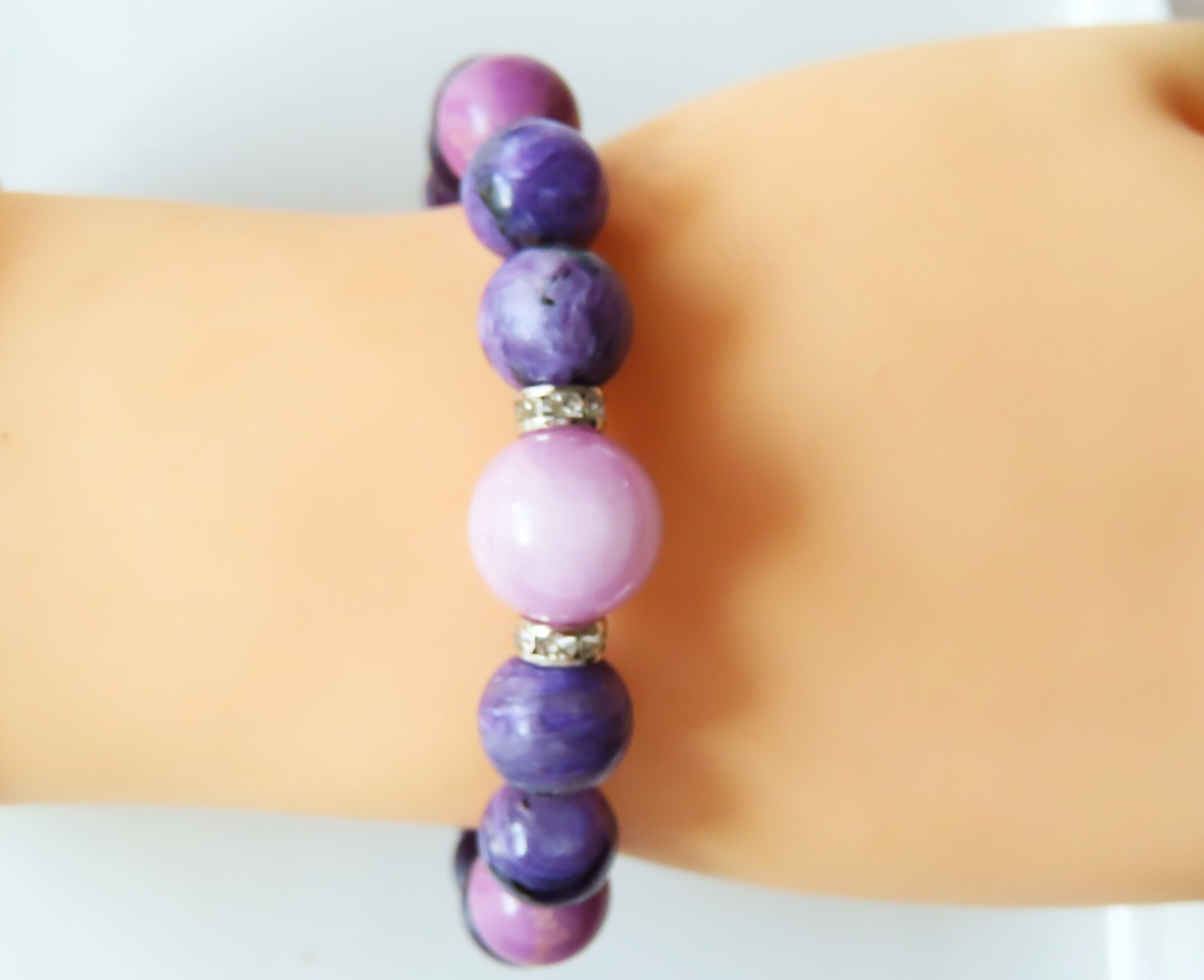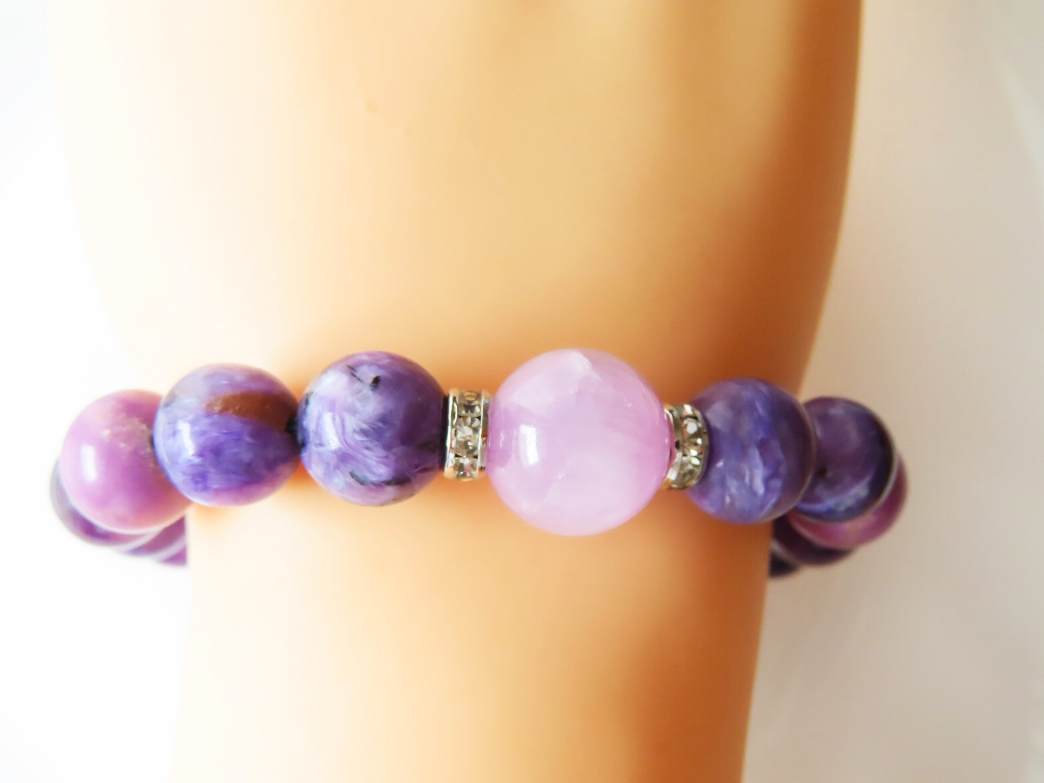 クンツァイト12㎜玉をメインに、チャロアイト、フォスフォシデライト、アメジスト、サファイア10㎜玉を使用したブレスレット