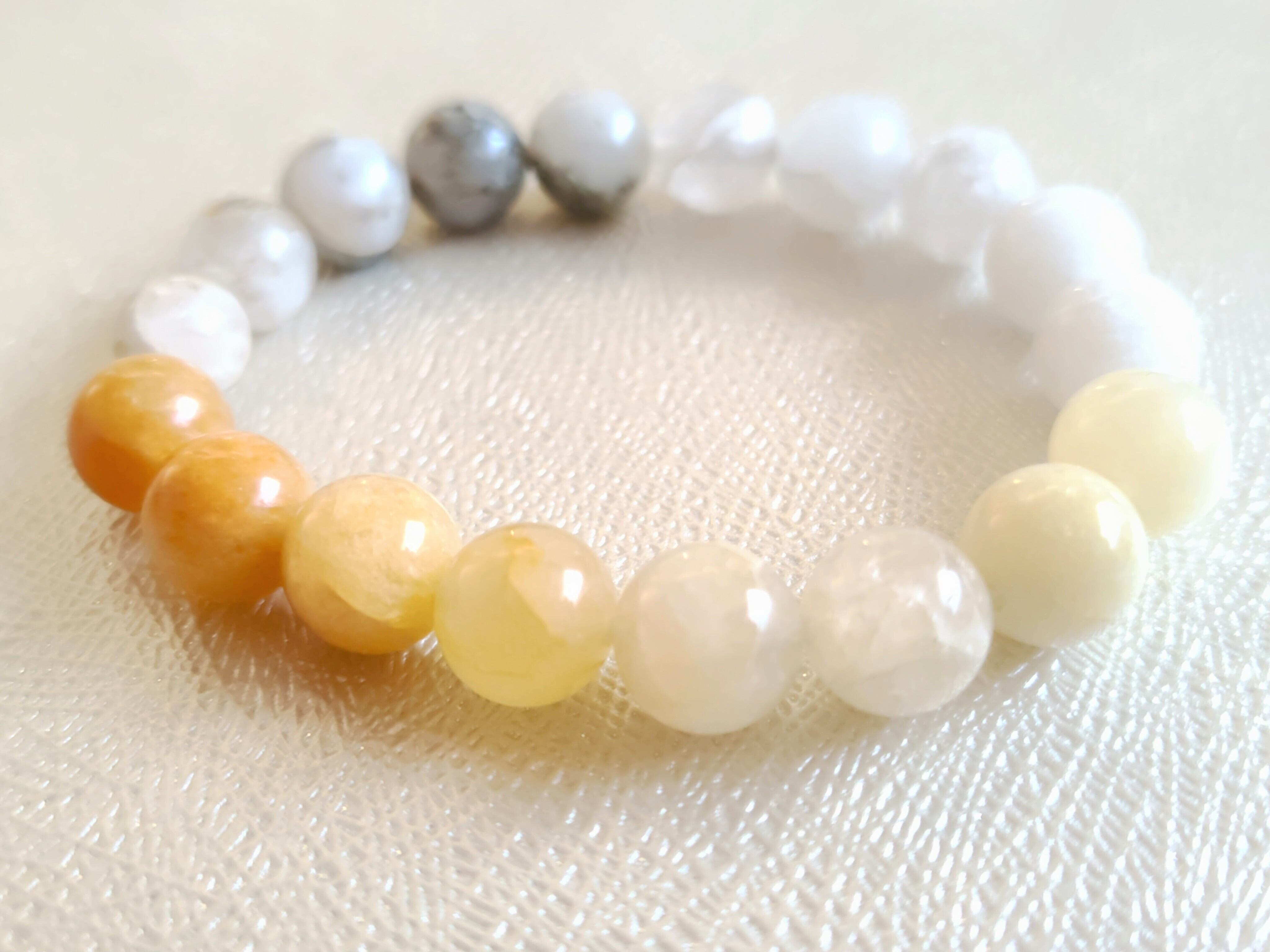白色から黄色、インクルージョンが入ったタイプまで、グラデーションを楽しめる一品。
